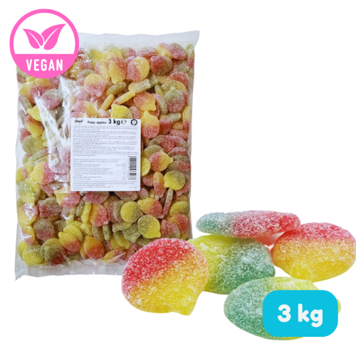 Frisia fizzy appels vegan 3kg bulk is een originele grootverpakking met zure, fruitige snoepjes in de vorm van kleine appeltjes. Deze kleurrijke snoepjes zijn 100% plantaardig en geliefd bij jong en oud. Perfect voor organisaties die inzetten op betaalbaar snoep in bulk. Professioneel verpakt en snel geleverd via Monkey House.