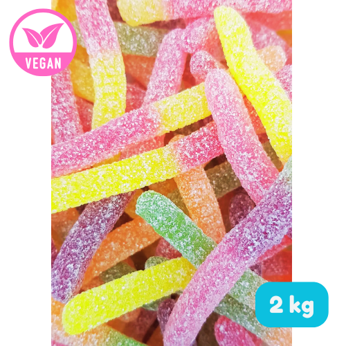 Frisia vegan snoep zure wormen bulk 2 kg bevat een kleurrijke selectie zachte snoepwormen met een frisse zure smaak. De wormvorm zorgt voor een speels effect dat meteen opvalt in snoepzakken. De levendige kleuren maken elk zakje aantrekkelijk en uitnodigend. Dankzij de zachte structuur blijven de snoepjes aangenaam in de mond en makkelijk te verwerken.