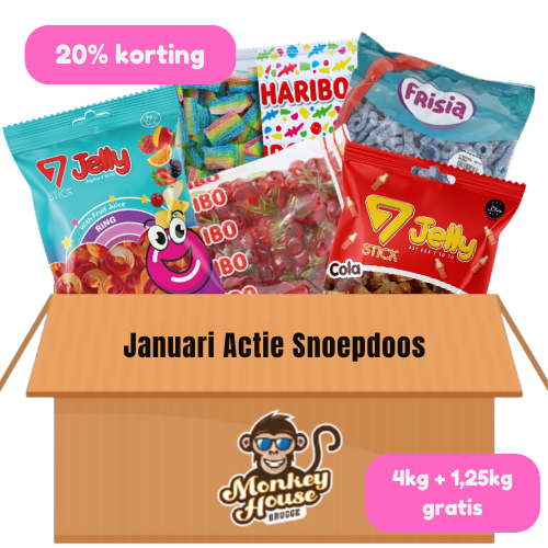 Voor zoetekauwen die goedkoop willen snoepen is er de Januari Actie Snoepdoos met 20 procent korting. Je krijgt 4 kg snoep + 1,25 kg extra, samen goed voor 5,25 kg snoep in bulk aan €35.
