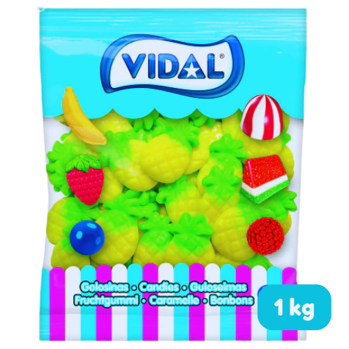 Vidal Snoep Grote Ananas bulk 1kg zijn zachte, opvallend grote fruitsnoepen in de vorm van een rijpe ananas. Ze hebben een helder gele kleur met een groene top en een frisse, zoete ananassmaak die meteen opvalt. De zachte bite en tropische geur maken ze een absolute favoriet binnen het Vidal-assortiment.