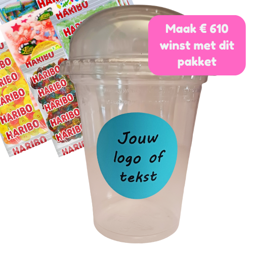 Met dit totaalpakket krijg je 200 lege bekers van 250 gram, 50 kg heerlijk snoep en gepersonaliseerde stickers in een kleur naar keuze, bedrukt met jouw logo of tekst. Kies uit snoepmix, zoet, zuur of vegan en vul de bekers zelf voor de laagste kostprijs en hoogste marge. Perfect voor fundraising, crowdfunding en winstgevende verkoopacties.