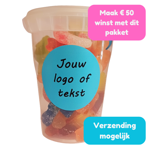 Met deze bekers maak je gegarandeerd indruk. Je kunt kiezen uit vier verschillende vullingen: een vrolijke mix, alleen zoet, heerlijk zuur of een vegan-variant. Zo pas je jouw bestelling volledig aan naar de smaak van jouw doelgroep. Laat bovendien jouw logo, naam of persoonlijke boodschap op de beker zetten om de actie extra professioneel en herkenbaar te maken.